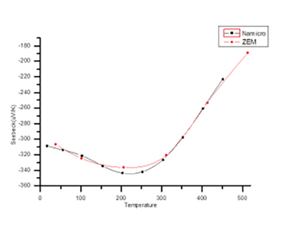 太原理工購(gòu)買(mǎi)熱電參數(shù)測(cè)試系統(tǒng)Namicro-3L,測(cè)試MgSi樣品Seebeck系數(shù)和電阻率數(shù)據(jù)與ZEM-3數(shù)據(jù)對(duì)比結(jié)果